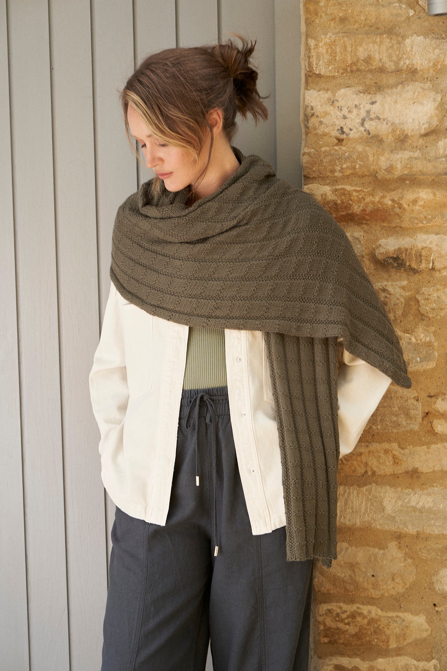 Designed in Rowan Summerlite 4ply, this wrap was inspired by the hedgerows of our Cotswolds landscape, coming to life in a dense green colour, freshly cut to be uniform.