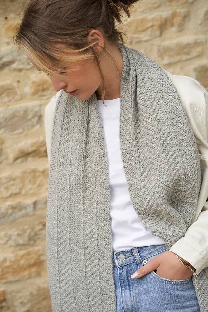 Dormy is a firm favourite in the knit + wear studio. Using the delicately soft fibre of Rowan Yarns Alpaca Soft DK, this scarf uses a textured herringbone stitch throughout which is worked in knit and purl stitches, edged with a ribbed hem.