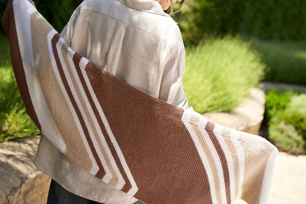 Our Meadow shawl showcases the tonal hue of three shades of Rowan Yarns Alpaca Soft DK. Worked in garter stitch with a moss stitch edging. Meadow starts at the pointed edge and increases are worked inside the edging, the pattern then swaps to work increases and decreases on the same row which keeps the width and adds length. When complete the shawl will measure 130cm long and 40cm wide (at the widest part).