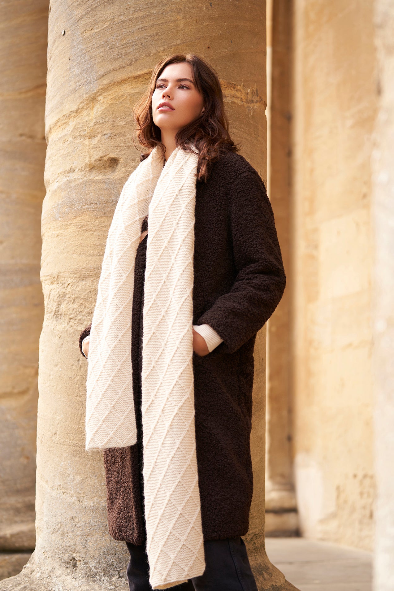 The yarn gives great definition creating a simple but effective 1 x 1 rib beanie which can also be worn with a turned back brim + a garter stitch scarf with travelling rib diamonds to bring interest and detail.