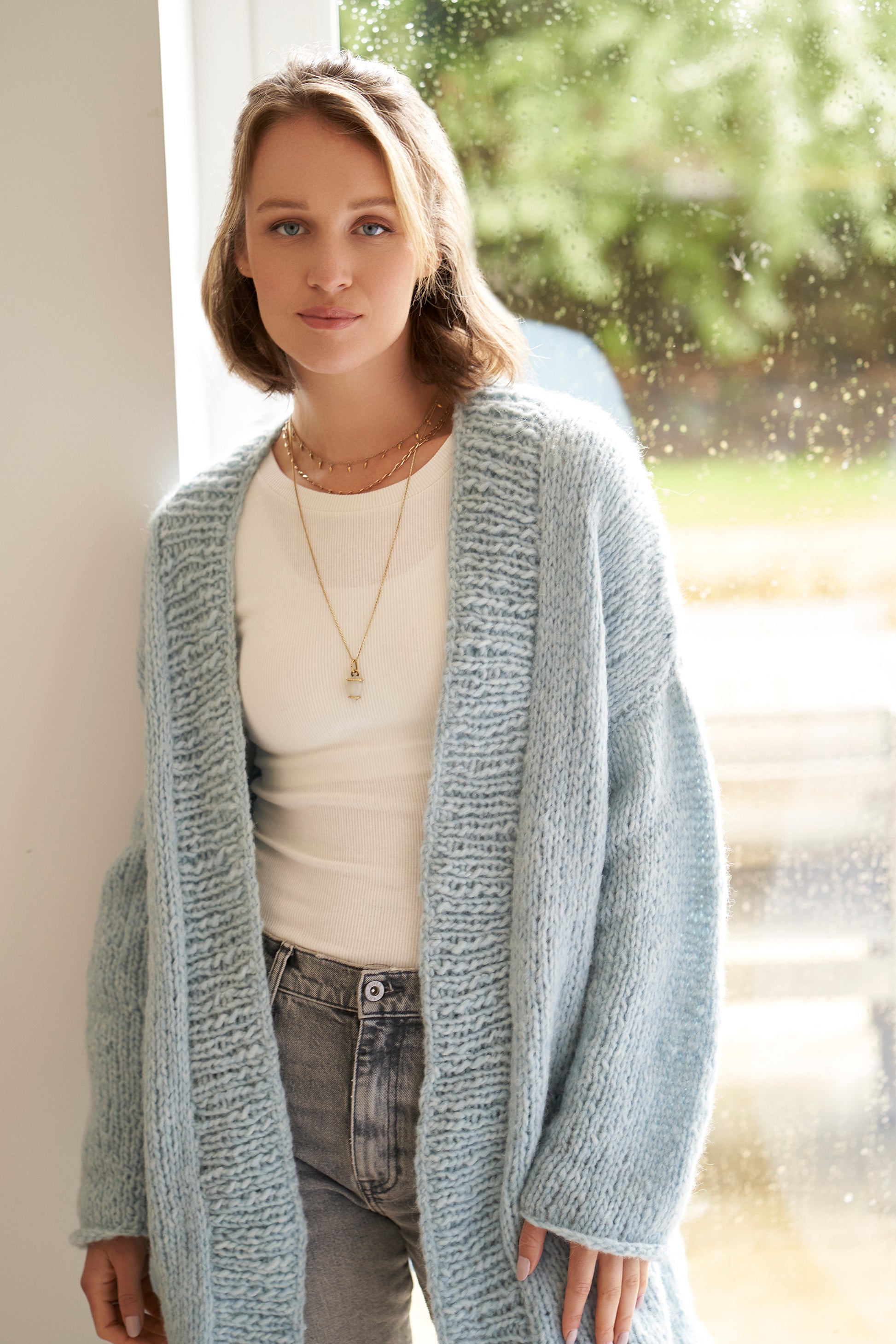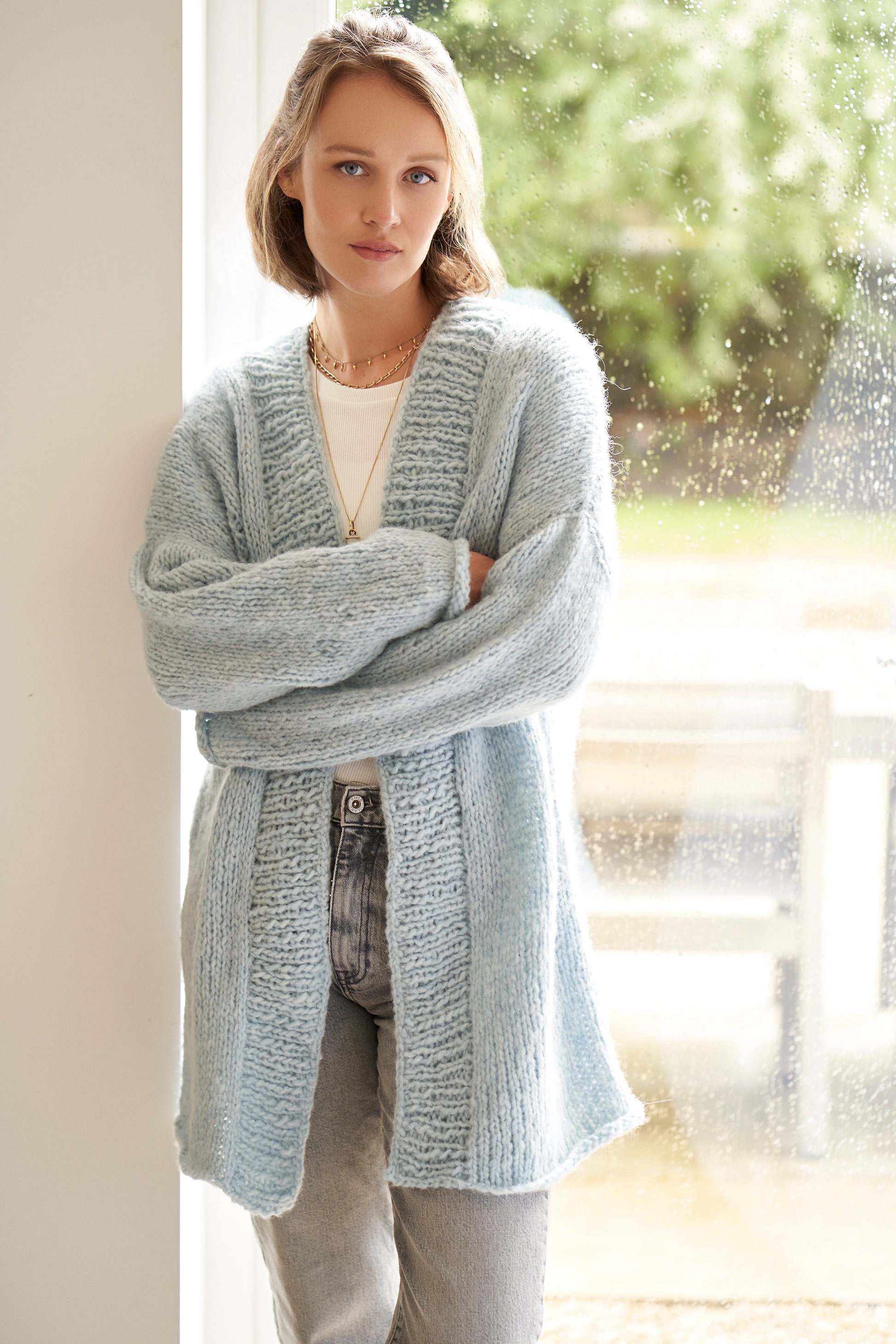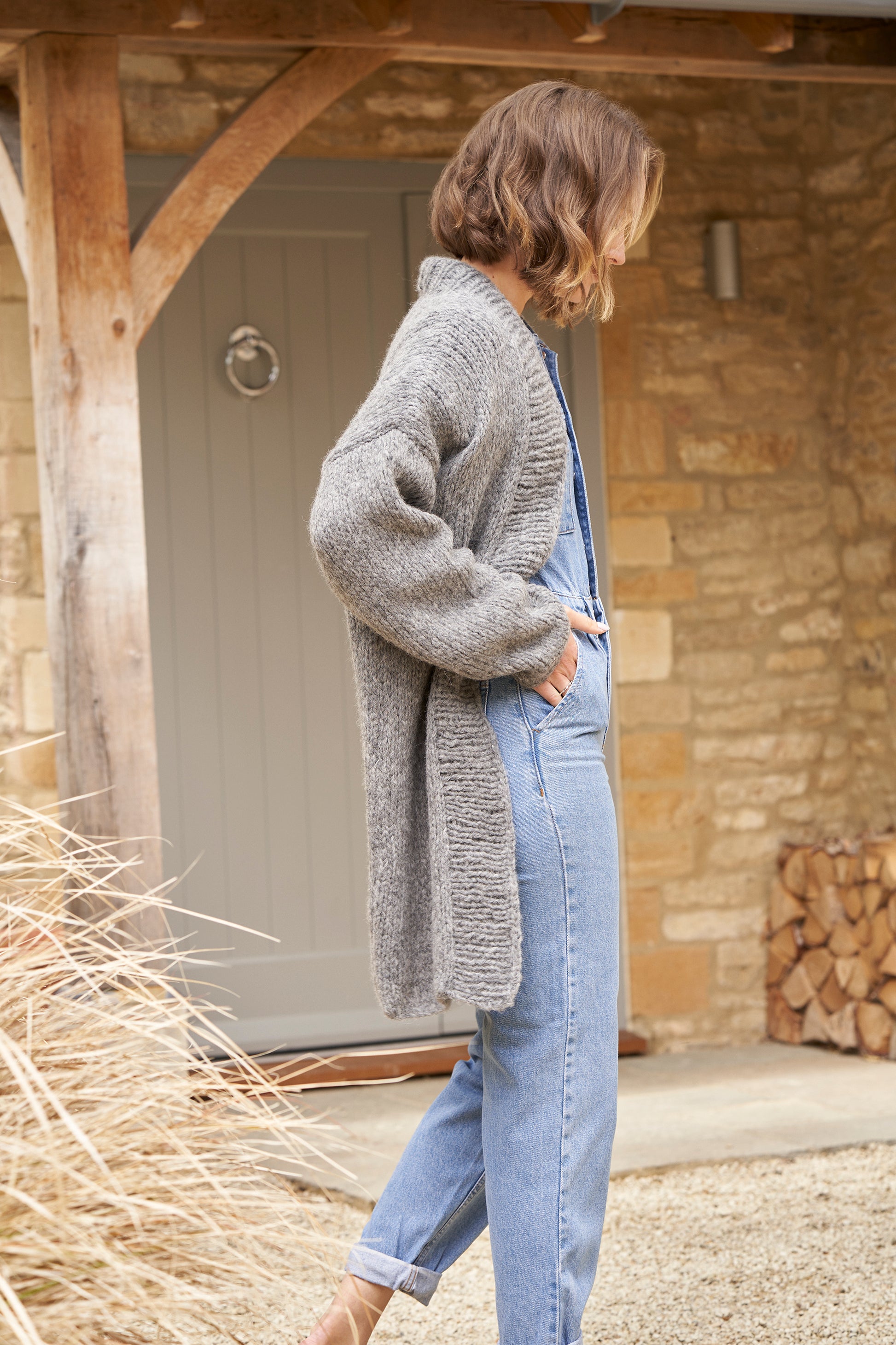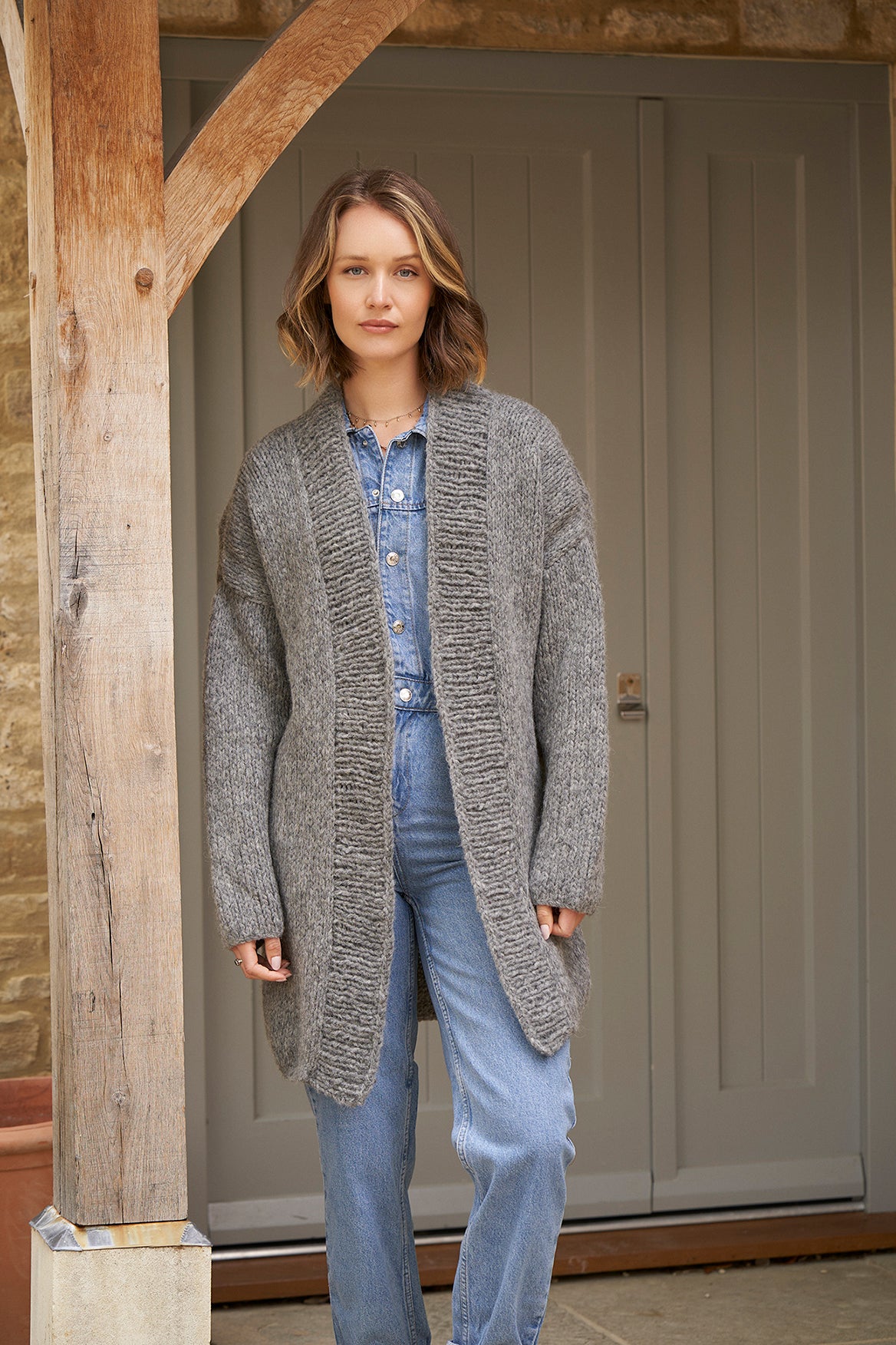 Shale is a mid thigh-length cardigan made in Rowan Yarns Brushed Fleece. Knitted in stocking stitch on a larger needle, this will a be quick to knit project for those who just can’t wait to wear. The drop sleeves and ribbed band finishes off this understated yet wearable design.